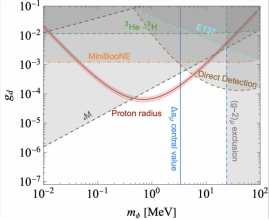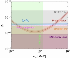 图:解释缪子g-2异常和质子半径之谜的参数空间及各类实验限制。