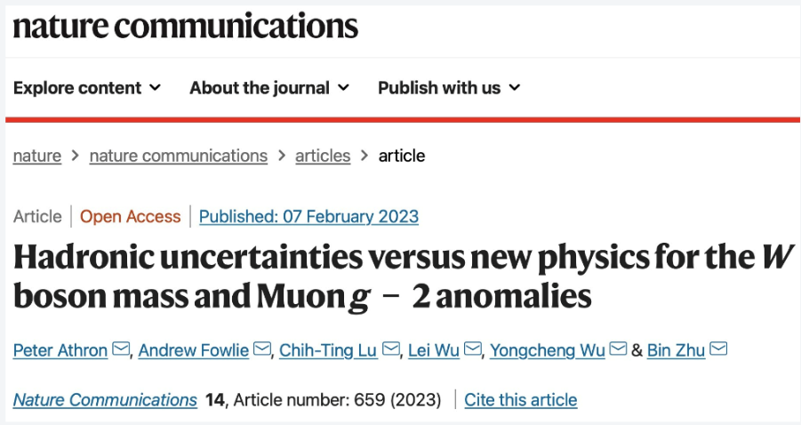 祝斌副教授同南京师范大学武雷教授团队(PeterAthron、Andrew Flowie、卢致廷、武雷、吴永成)在电弱精确测量拟合与新物理研究中取得重要研究进展。研究成果以“Hadronic Uncertainties versus New Physics for the W boson Mass and Muon g-2 Anomalies”为题发表《Nature Communication(自然.通讯)》(Nature Communications 14 (2023) 659)。按照高能物理的惯例,论文署名以字母顺序排名,祝斌副教授为共同通讯作者。