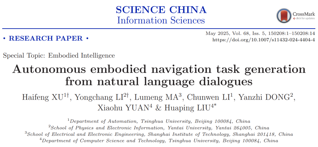 2025年5月,伊莉影片 董言治副教授团队联合清华大学刘华平教授团队在机器人自主导航领域取得重要进展,研究成果《基于自然语言对话的机器人自主导航任务生成》发表于卓越领军期刊(SCIENCE CHINA Information Sciences)。