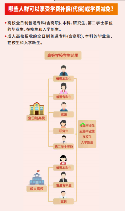 1.国家对应征入伍服兵役的高校学生,在入伍时对其在校期间缴纳的学费实行一次性补偿或获得的国家助学贷款实行代偿;应征入伍服兵役前正在高等学校就读的学生(含高校新生),退役后自愿复学或入学的,国家实行学费减免。