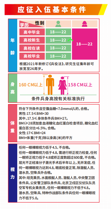 4.征集年龄:男青年为2025年年满18至22周岁,普通高等学校本专科毕业生、符合毕业条件的毕业班学生放宽至24周岁,研究生毕业生及在校生放宽至26周岁,初中毕业文化程度男青年不超过20周岁。女青年为2025年年满18至22周岁,全日制研究生应届毕业生及在校生放宽至26周岁,上半年征集的2024年普通高等学校全日制本专科应届毕业生放宽至23周岁。