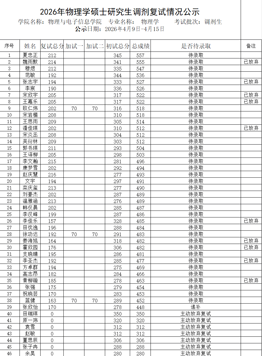 2026年物理学硕士研究生调剂复试情况公示