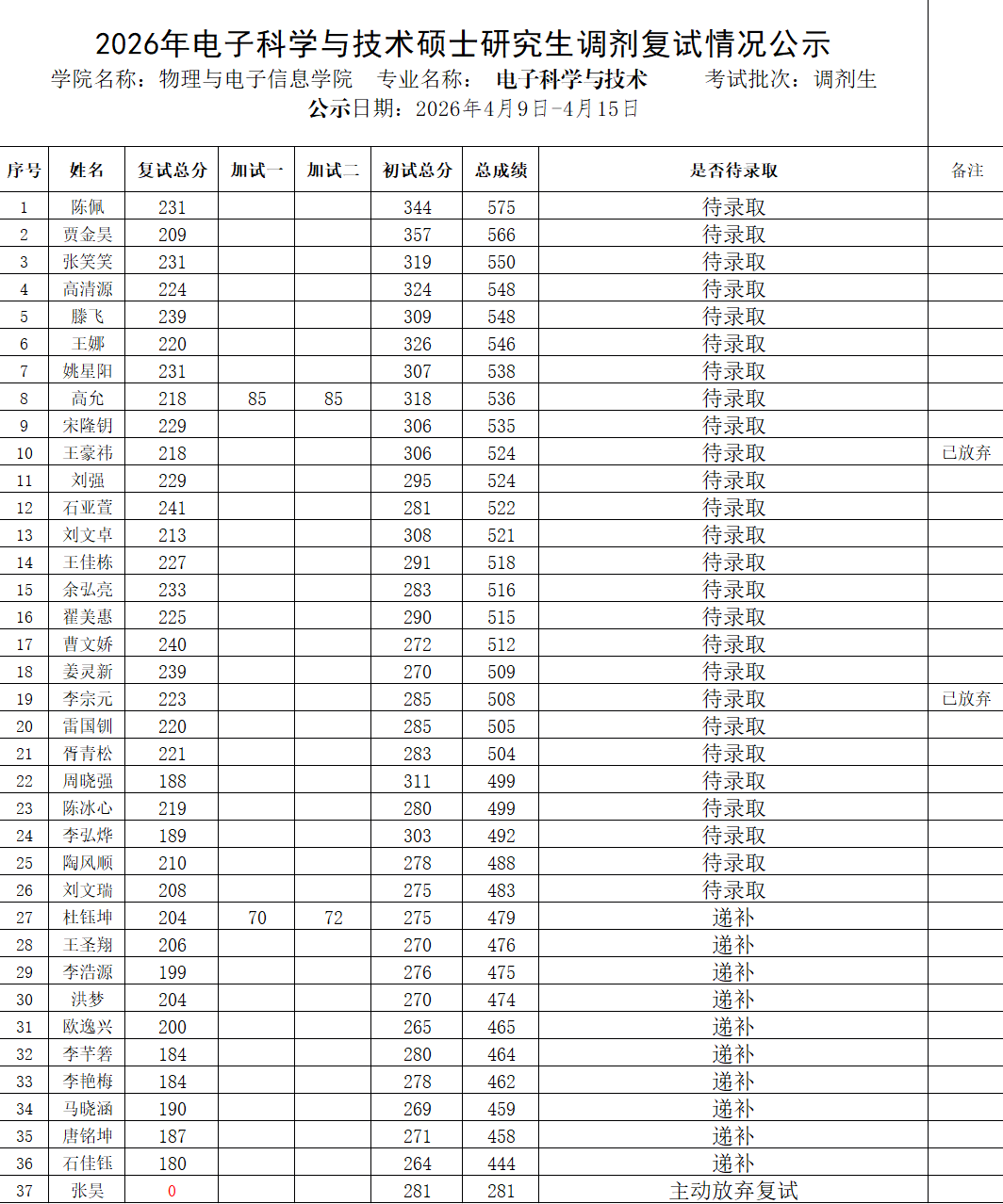 2026年电子科学与技术硕士研究生调剂复试情况公示