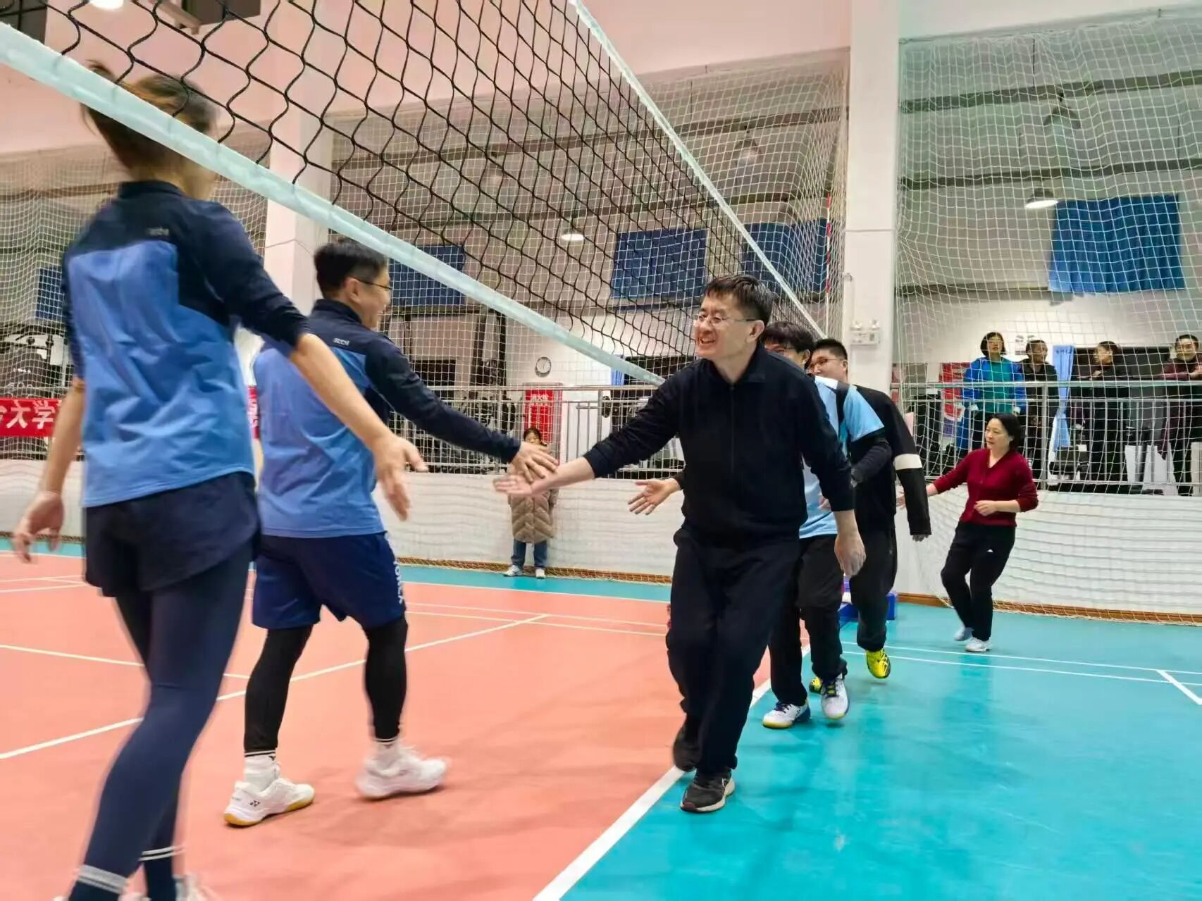 从12月1日首战对阵文新学院的清脆哨声起,物电学院教职工们便以饱满状态投入每一场较量;12月3日与国交学院的对决中,队员们用灵活的走位与精准的发球把控节奏;12月5日迎战药学院时,更是以默契的拦网与快攻将团队协作展现得淋漓尽致。